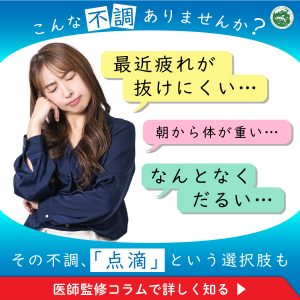 また、点滴をうけられない間のホームケアとして、栄養豊富な食事やサプリメントで補充することもおすすめです。