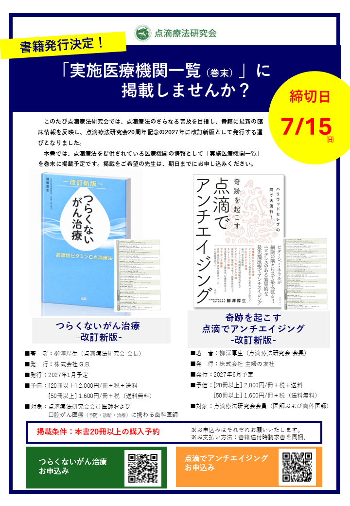 このたび点滴療法研究会では、点滴療法のさらなる普及を目指し、書籍に最新の臨床情報を反映し、点滴療法研究会20周年記念の2027年に改訂新版として発行する運びとなりました。