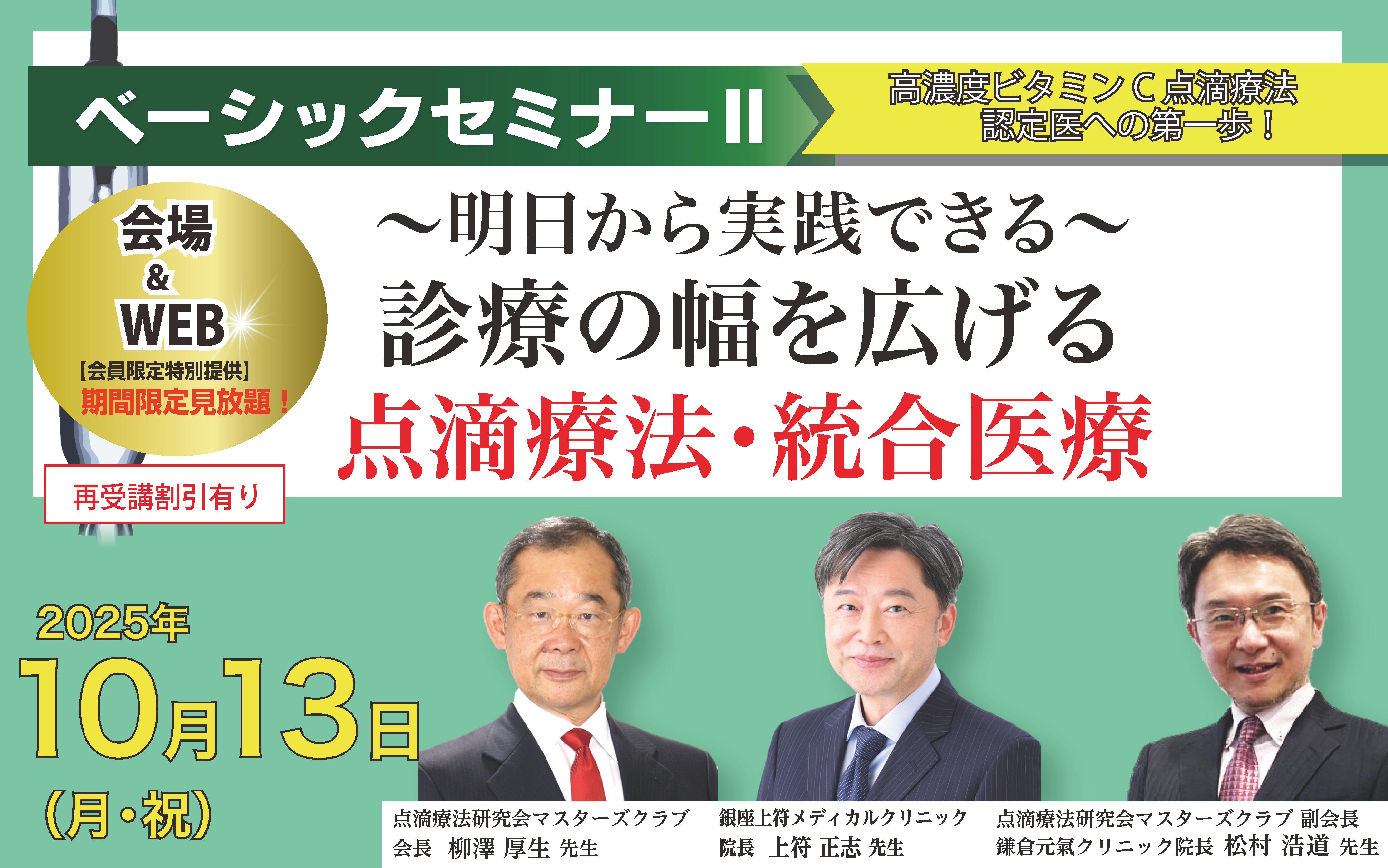 10/13-ベーシック・セミナーⅡ ~明日から実践できる~診療の幅を広げる点滴療法・統合医療2025/10/13 (月)13:00~18:00