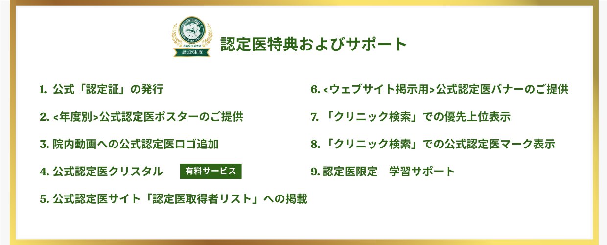 認定医を取得された先生方には、公式「認定証」の発行や各種提示物のご提供、ウェブ上での集患サポートなど、様々な特典やサポートをご用意しております。患者様との信頼関係を築き、安心して受診していただくために、ぜひ当会の認定医制度をご活用ください。