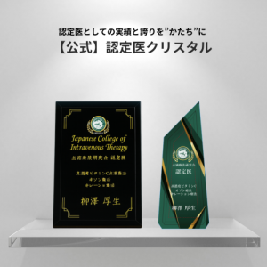点滴療法研究会が公式に提供する、認定医の証となるクリスタルです。クリニックへ来院された患者様への信頼度を向上させる院内に飾れる特別なアイテム。院内の雰囲気に合わせて、2種類からお選びください。
