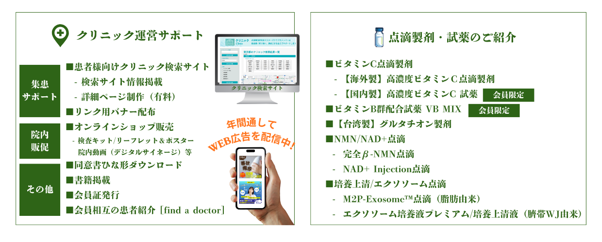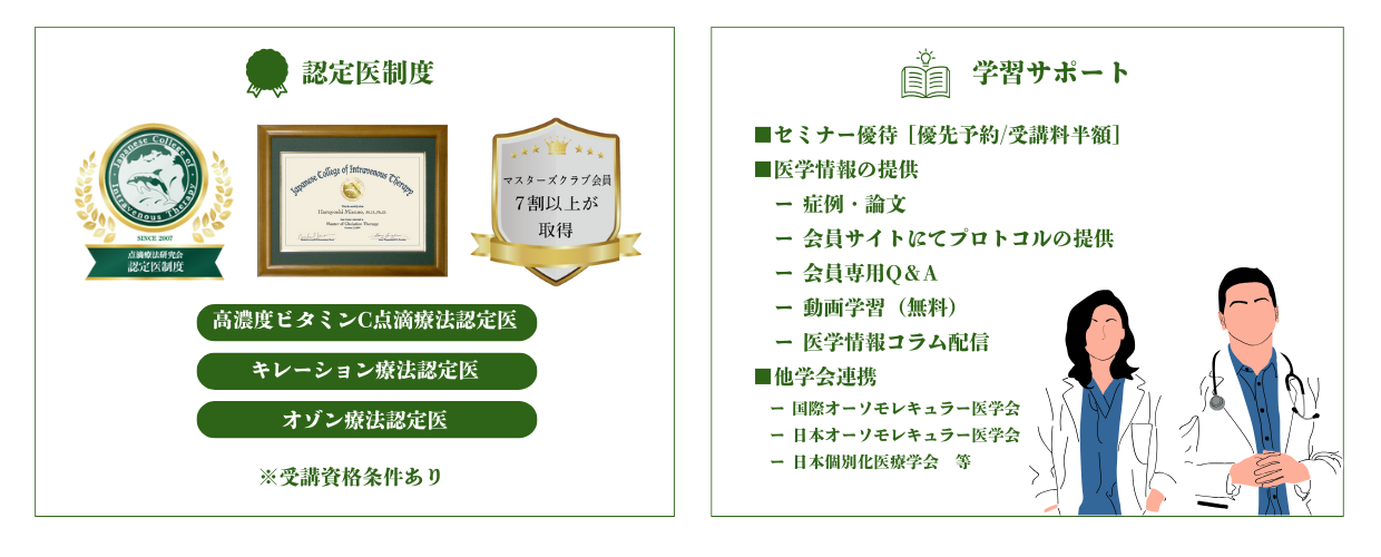 点滴療法研究会マスターズクラブでは、会員限定の情報ポータルサイトをはじめ、クリニック紹介や会員同士の情報交換の場の提供、認定医制度の運営を行っています。