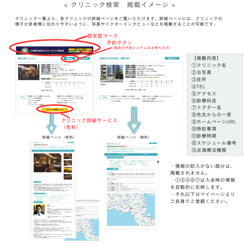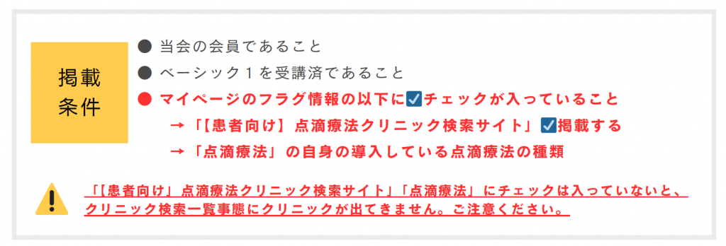 当会の会員の先生で、ベーシックセミナーⅠを受講された先生は患者様向けの点滴療法クリニックの検索一覧へ無料で掲載することが可能です。