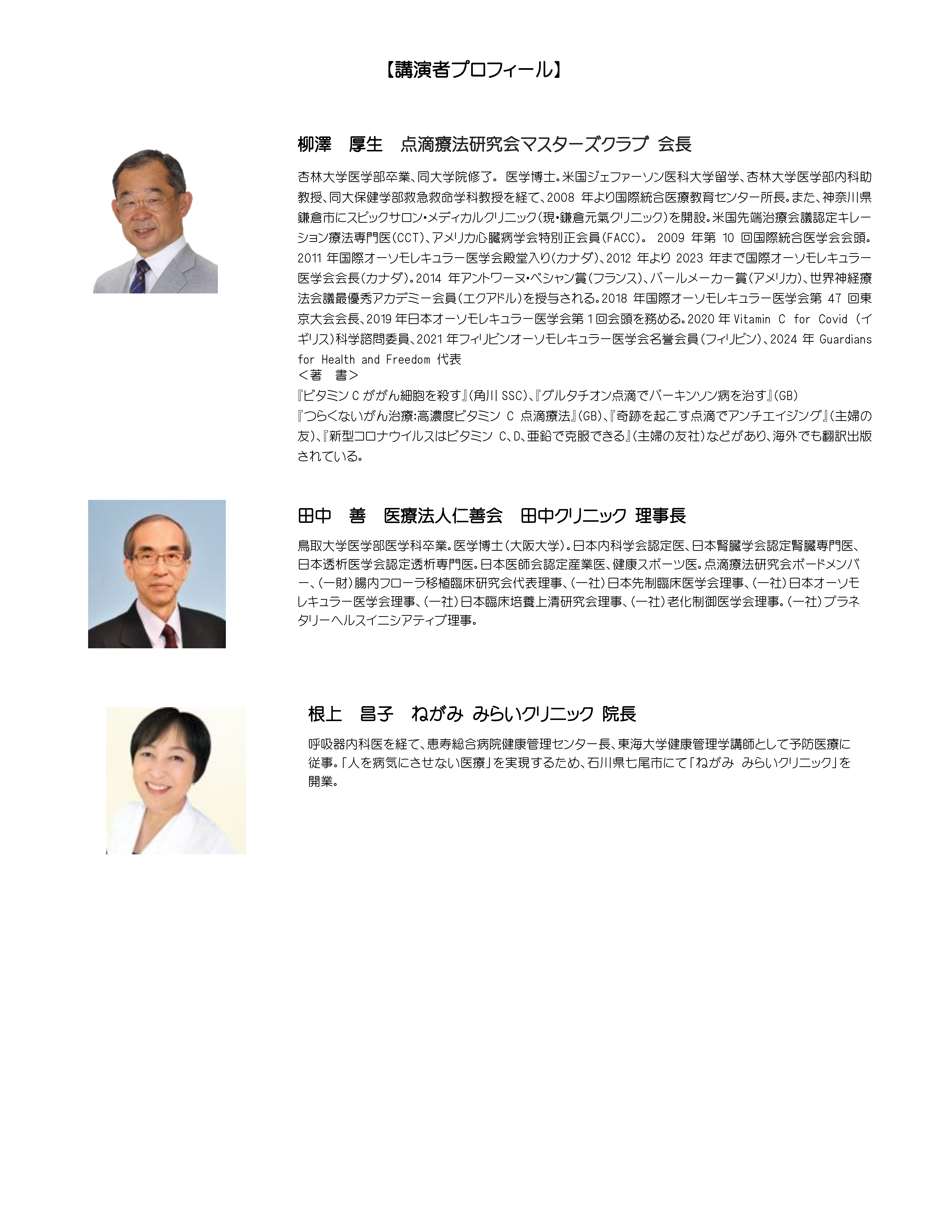 【キーワード】3大点滴療法の症状別個別化医療、年間5000本の現場から見えた患者ニーズとは、地方でもできるビタミンC点滴普及のための実践ガイド 等