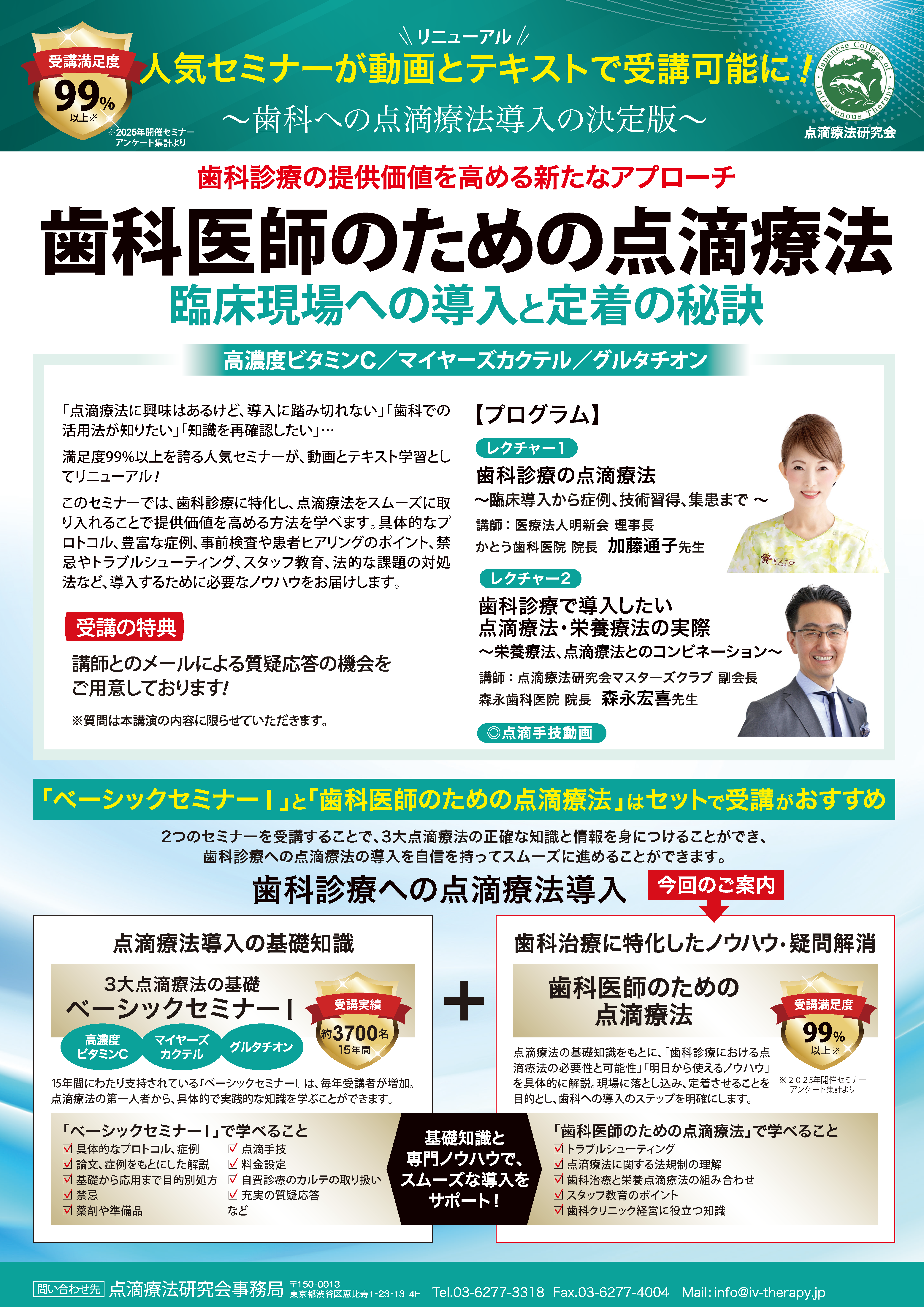 | 受 講 費 | マスターズクラブ会員 (25,000円) マスターズクラブ会員再受講(15,000円)※「歯科医師のための点滴療法ベーシック」・「歯科診療で導入したい点滴療法・栄養療法」も受講歴対象 非会員 (40,000円) |